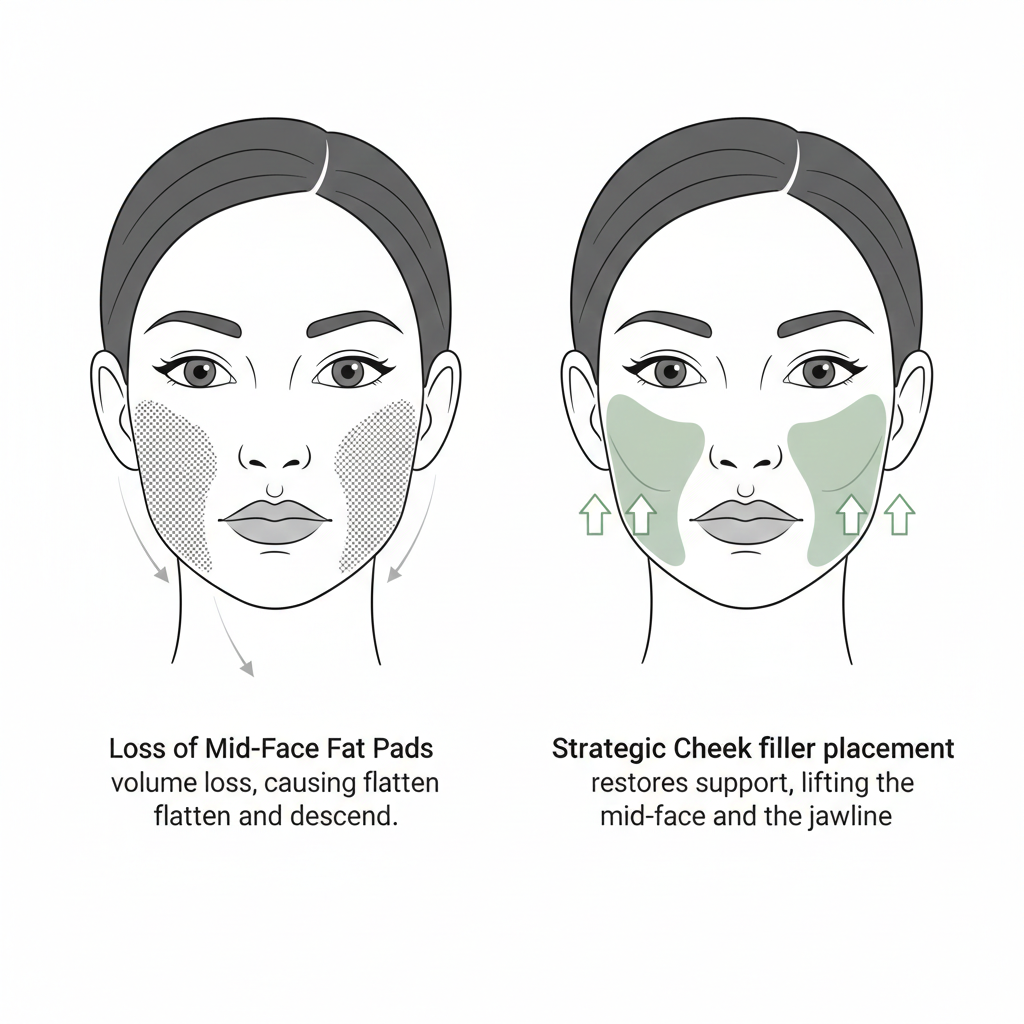 The Solution: Rather than just filling the crease—which can lead to an unnatural, puffy look—I often use Cheek Volumisation. By strategically placing dermal filler in the mid-face, we "anchor" and lift the cheek tissue back to its youthful position. This naturally tensions the skin, softening the nasolabial fold from above for a far more subtle and sophisticated result.